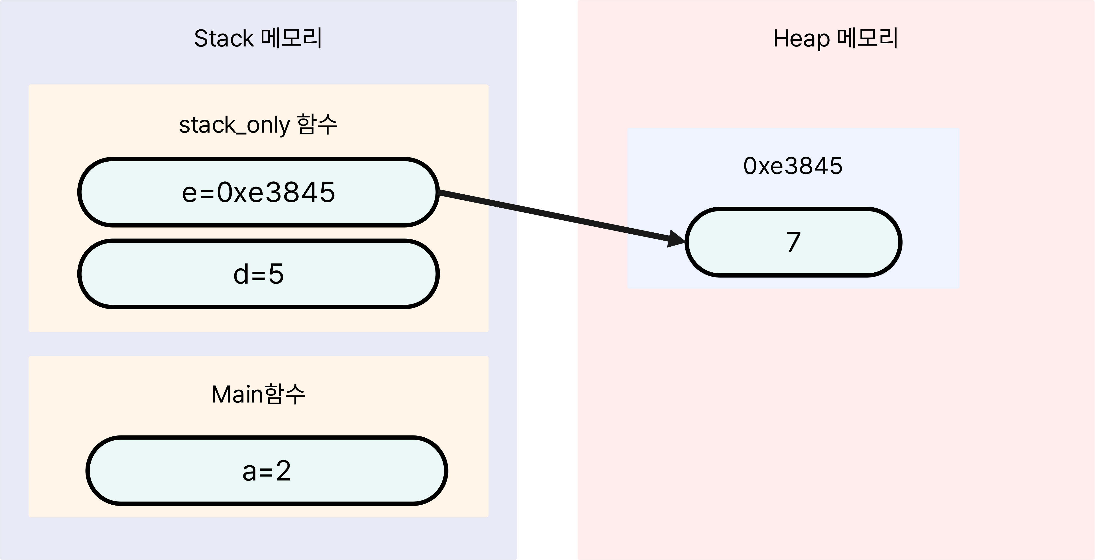- 위 코드에서 stack_and_heap 함수가 실행되면 지역변수 d는 stack메모리에 할당되고, 동적할당 변수 e는 Heap메모리에 할당된다.