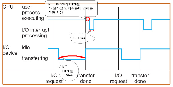 - 즉, I/O디바이스는 CPU에서 병렬적으로 실행중이며