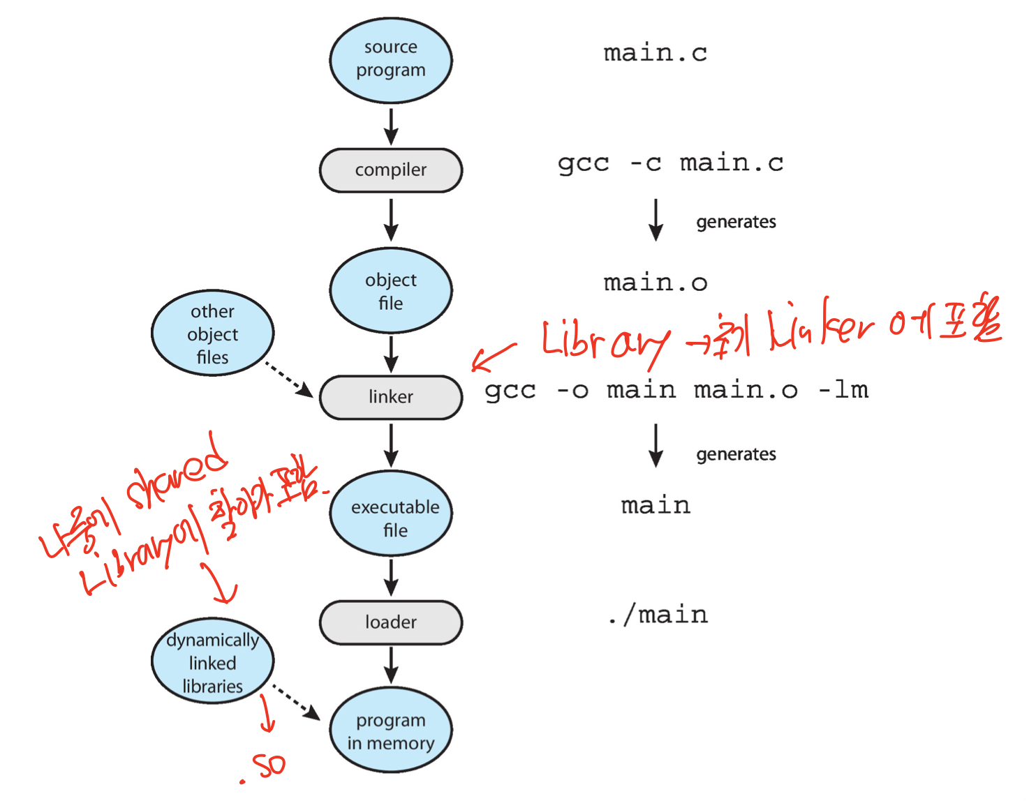 - 그래서 Library함수를 포함한 binary file로 Secondary Memory에 저장해둔다.